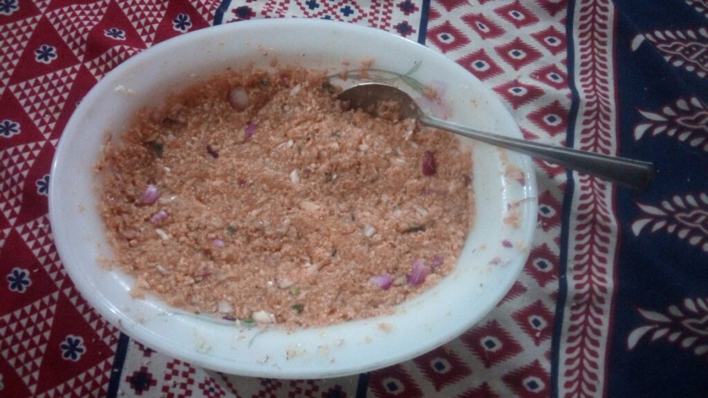 Now add some salt, black pepper, red chilli powder (optional), breadcrumbs, seasoning powder, milk, and egg to the processed material. And thoroughly mix these ingredients with the material by hand or with a big spoon.