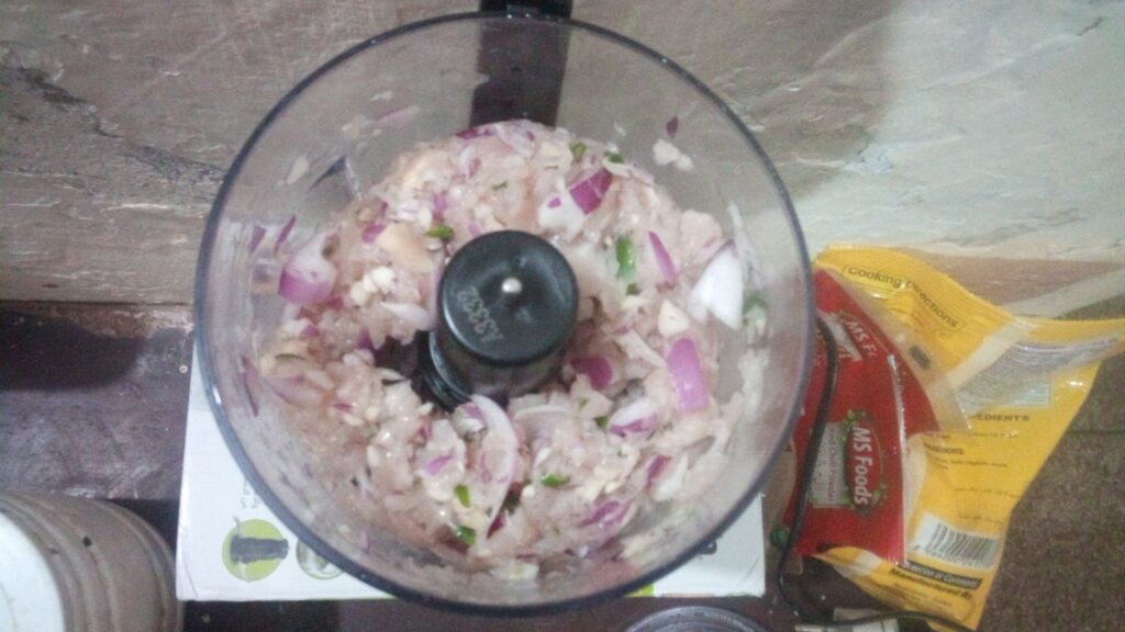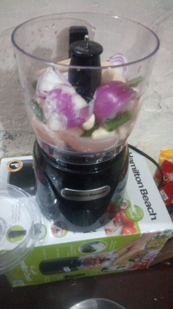 First of all, peel off your onion, garlic cloves, & ginger and cut them into big pieces so that these can be processed with your food chopper easily. Also, cut the green chilli into small pieces. Then, cut the chicken breast pieces into medium components so that the components can be processed through your chopper without any issue. Afterwards, add the veggies and chicken components into the chopper and process them with short breaks. But be careful. Don’t overprocess the material. Otherwise, your material won’t be hard enough to make a rectangular loaf.