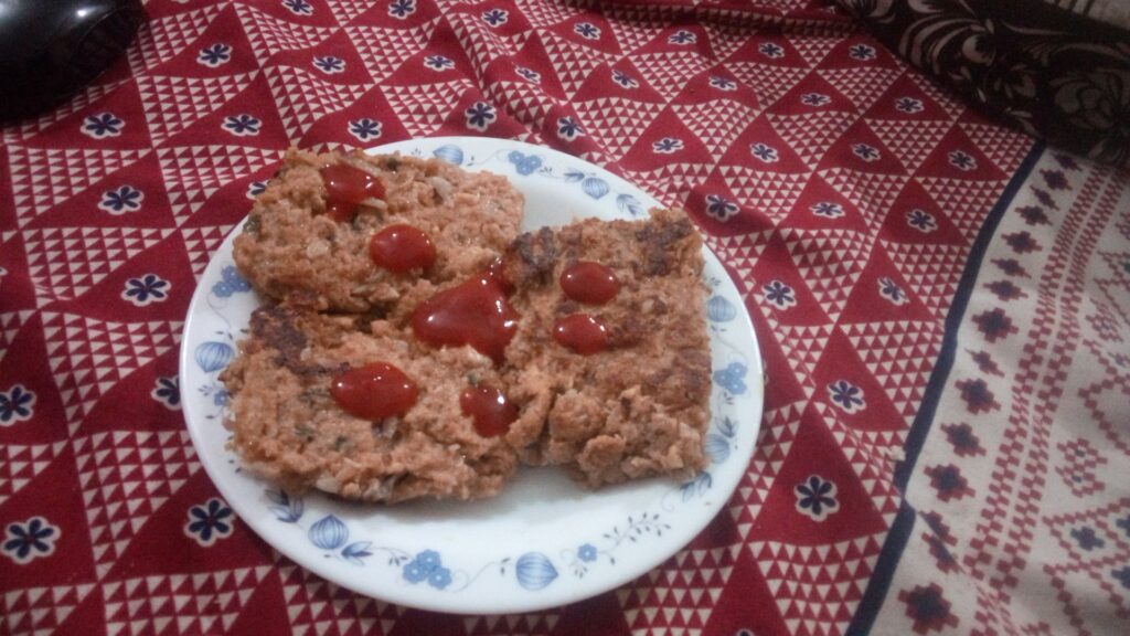 So you should turn on your stove, place a frying pan on the stove, and add some cooking oil on the pan. Then, give your material a rectangular shape by the use of a flat big spoon or spatula. But make sure your loaf is not thick. Otherwise, it won’t be much crispy after frying. Next, shallow fry the loaf on the pan under medium heat for 8-10 minutes and flip it during this period when needed.
